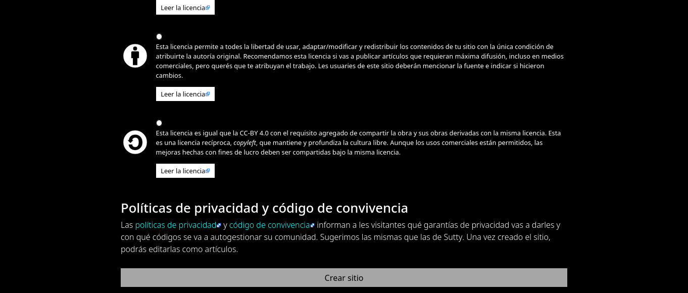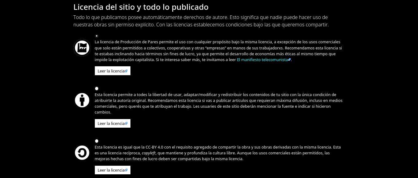 Finally, you’ll need to choose a license for all the content you publish on your site. Sutty offers three possible licenses but you can also use your own custom license. Remember that when there’s no license, all rights are reserved, in other words, it will be copyrighted.